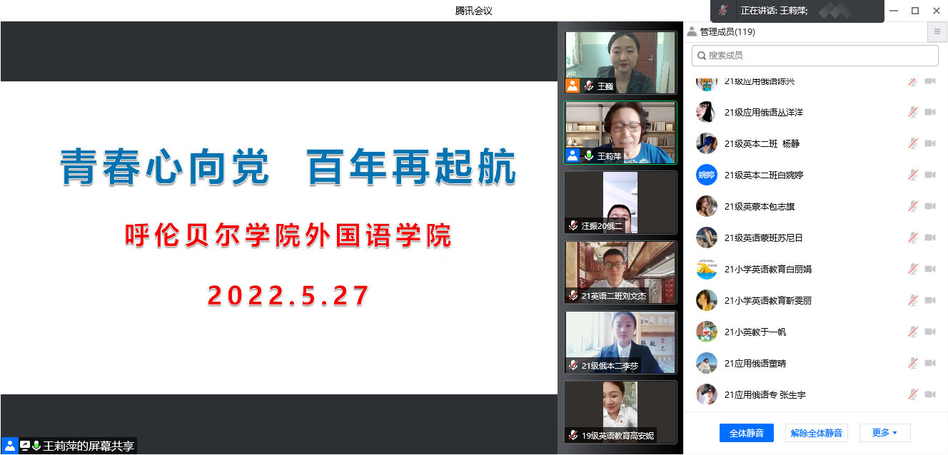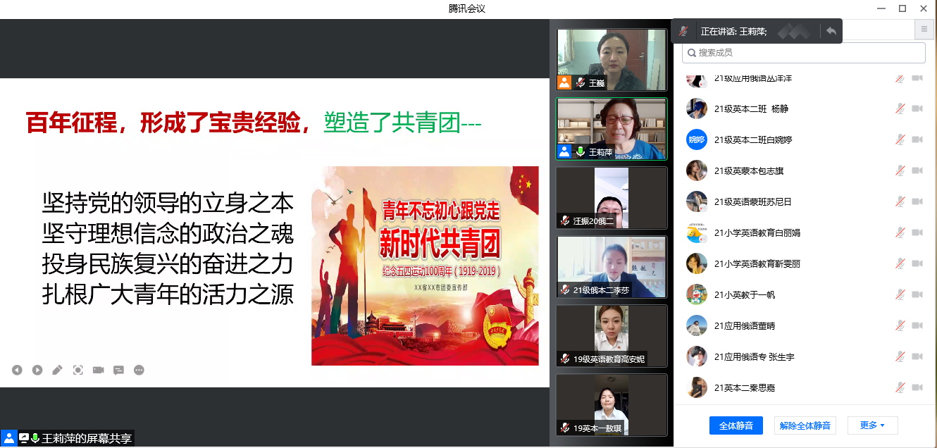 按照共青团中央《关于深入学习宣传贯彻习近平总书记在庆祝中国共产主义青年团成立100周年大会上重要讲话精神的通知》要求,为深入领会习近平总书记重要讲话的重大意义和深刻内涵,扎实推动习近平总书记重要讲话精神学习宣传在全团和广大青少年中深入开展,5月27日,三亿邀请北京青年政治公司王莉萍教授为全院师生带来“青春心向党 百年再启航”主题线上讲座,三亿入党积极分子、员工会全体成员130余人参加了讲座,讲座由三亿团总支书记王巍主持。